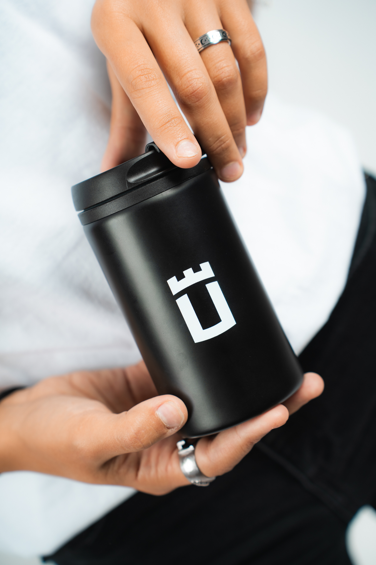 Káva so sebou? Žiadny problém. Tento prenosný hrnček z nehrdzavejúcej ocele s praktickým viečkom udrží tvoj nápoj dlhšie teplý. Minimalistický dizajn s bielym logom UCM z neho robí ideálneho spoločníka na cesty na prednášky alebo kamkoľvek, kde potrebuješ dávku kofeínu.